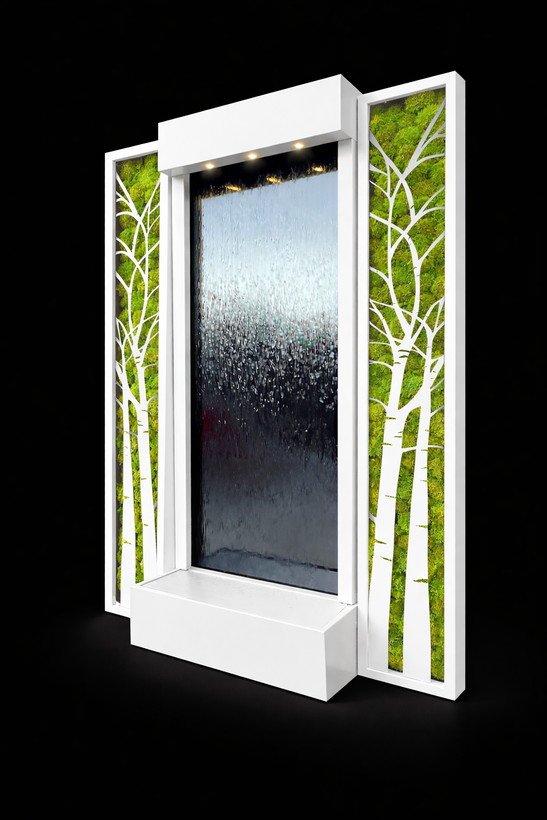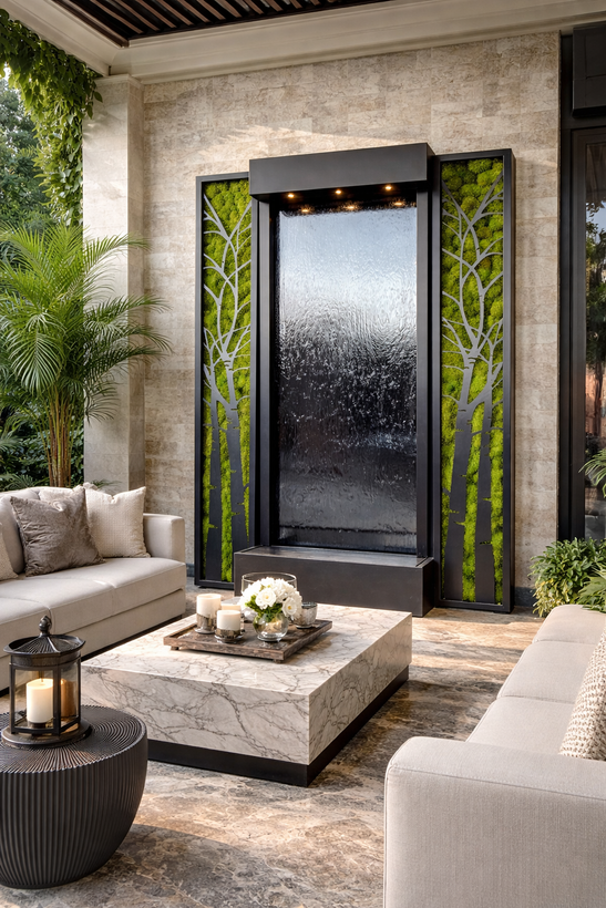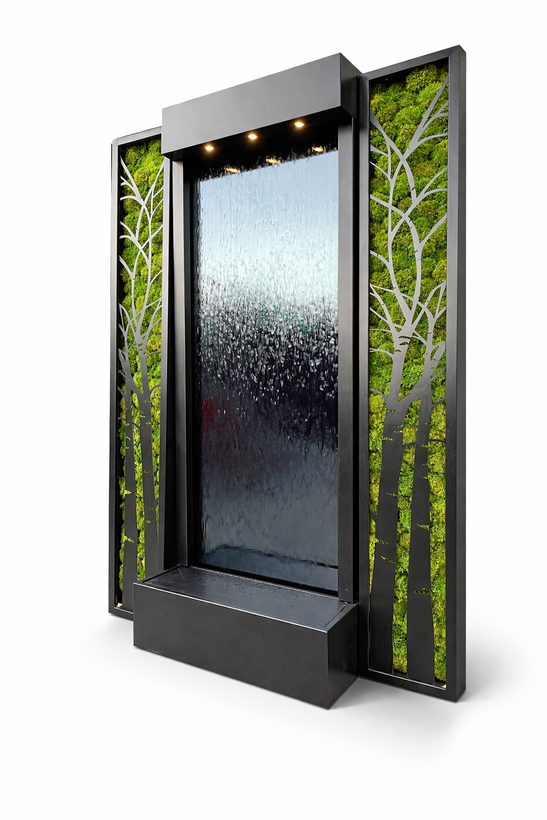 آبنما آینه ای دکوراتیو همراه با پنل سی ان سی طرح درخت و ماس وال همراه با نورپردازی