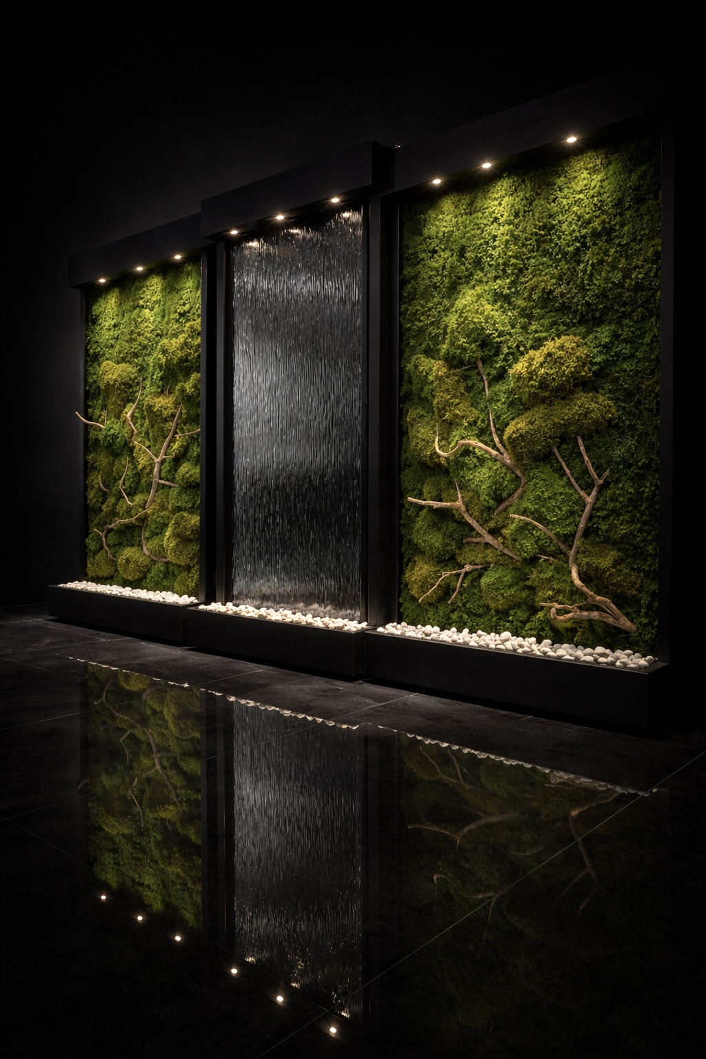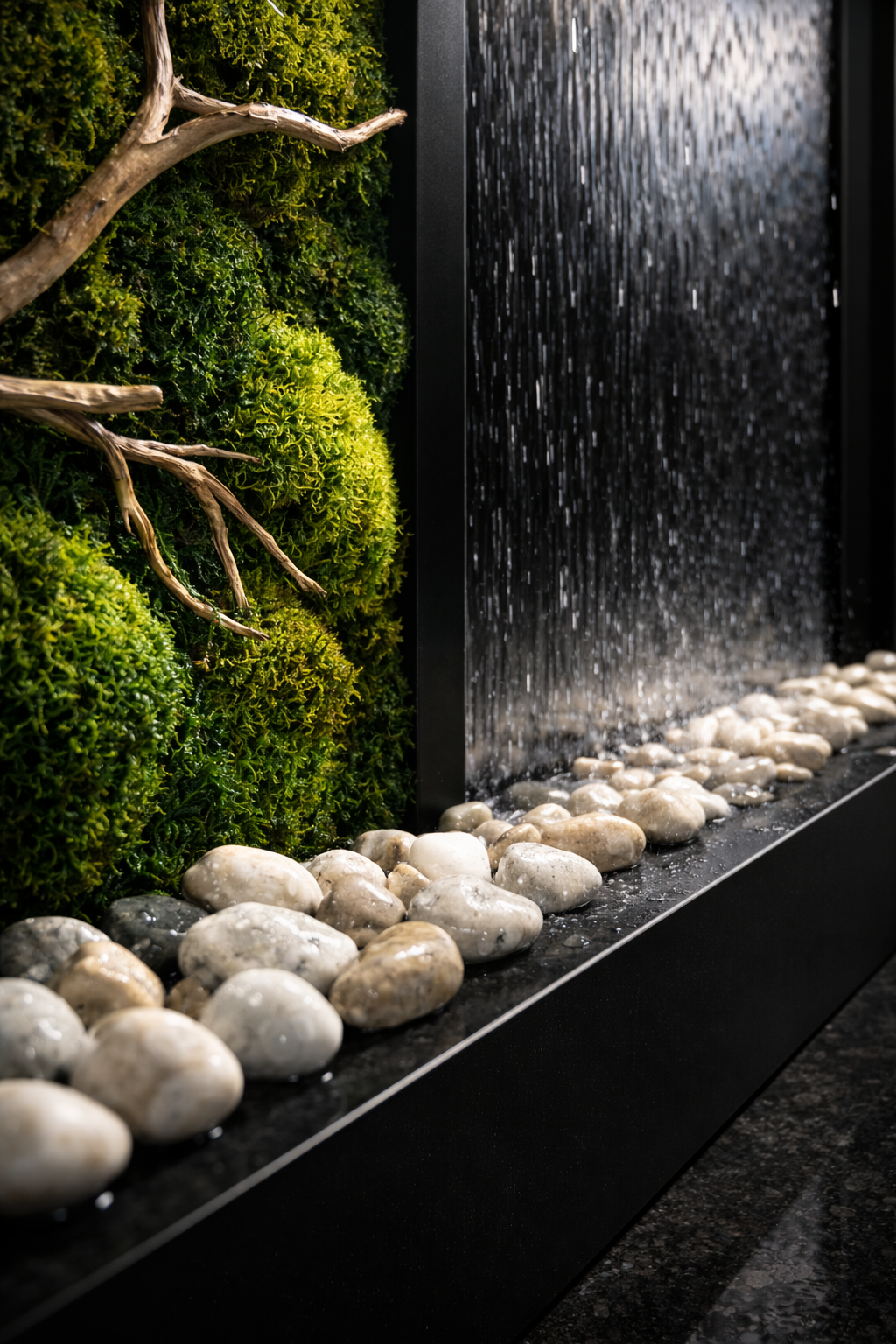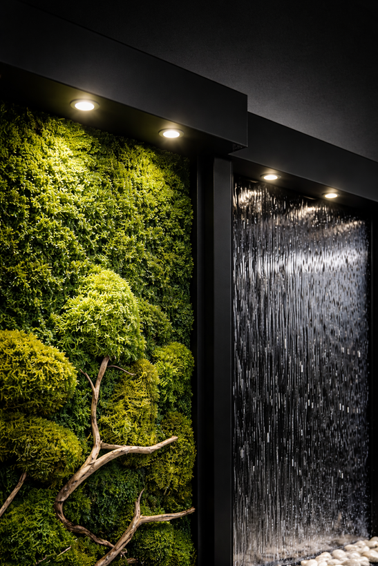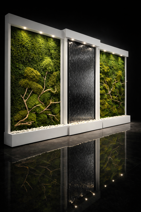 این آبنما همراه با دو پنل دیوار سبز خزه ای طبیعی تثبیت شده میباشد.